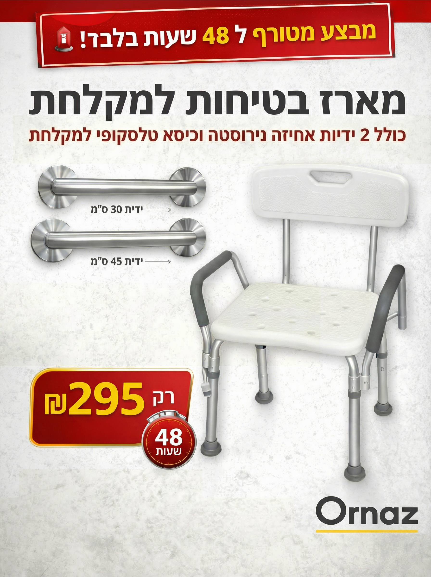 כולל 2 ידיות אחיזה נירוסטה וכיסא טלסקופי למקלחת